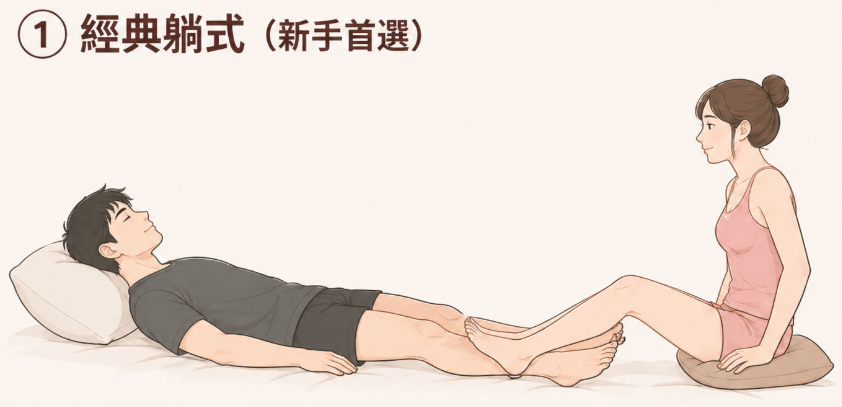 新手從經典躺式入手,搵到節奏感;想要視覺刺激試坐式對向;想換感受角度試背對躺式;想要最強親密感選側臥夾式