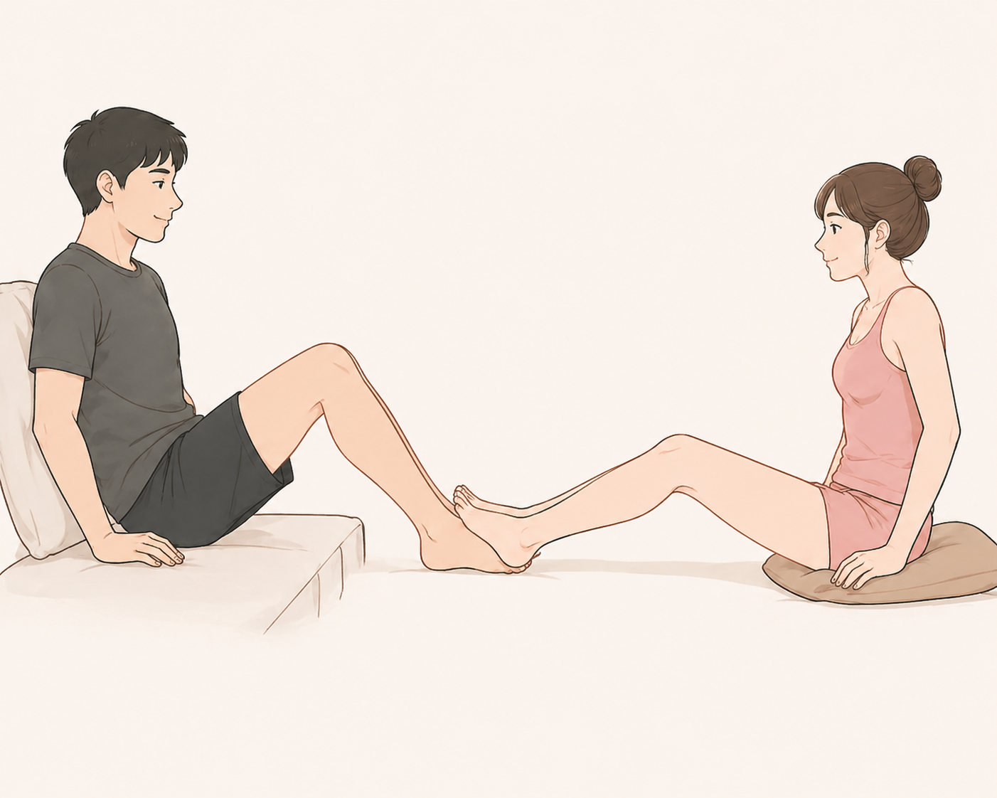 女方坐得太遠或太近,令腳板角度扭曲,用力方式變得勉強。建議喺開始前先調整好距離,確認腳板能自然平貼,唔使刻意繃腿。