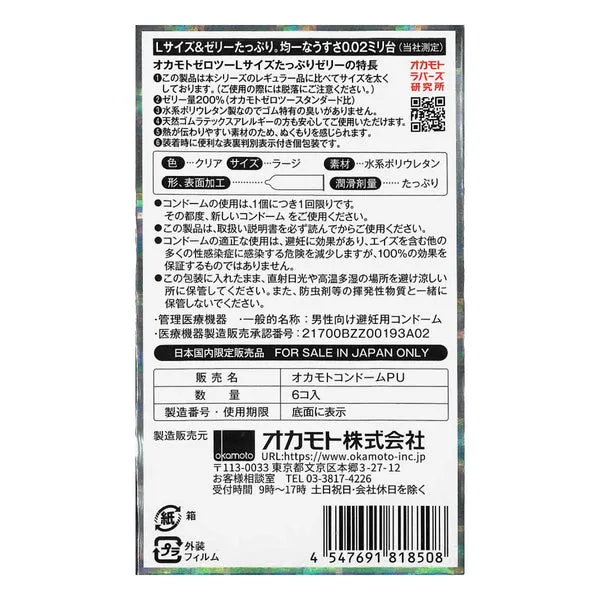 岡本(日本)0.02 PU安全套系列以極致薄度與高傳熱性聞名,而這款「滑劑加量大碼版」專為追求更舒適、更順滑體驗的人士設計。採用水性聚氨酯(PU)材質製成,不含天然乳膠成分,觸感柔滑細膩,同時具備優秀的貼合度與耐用性。