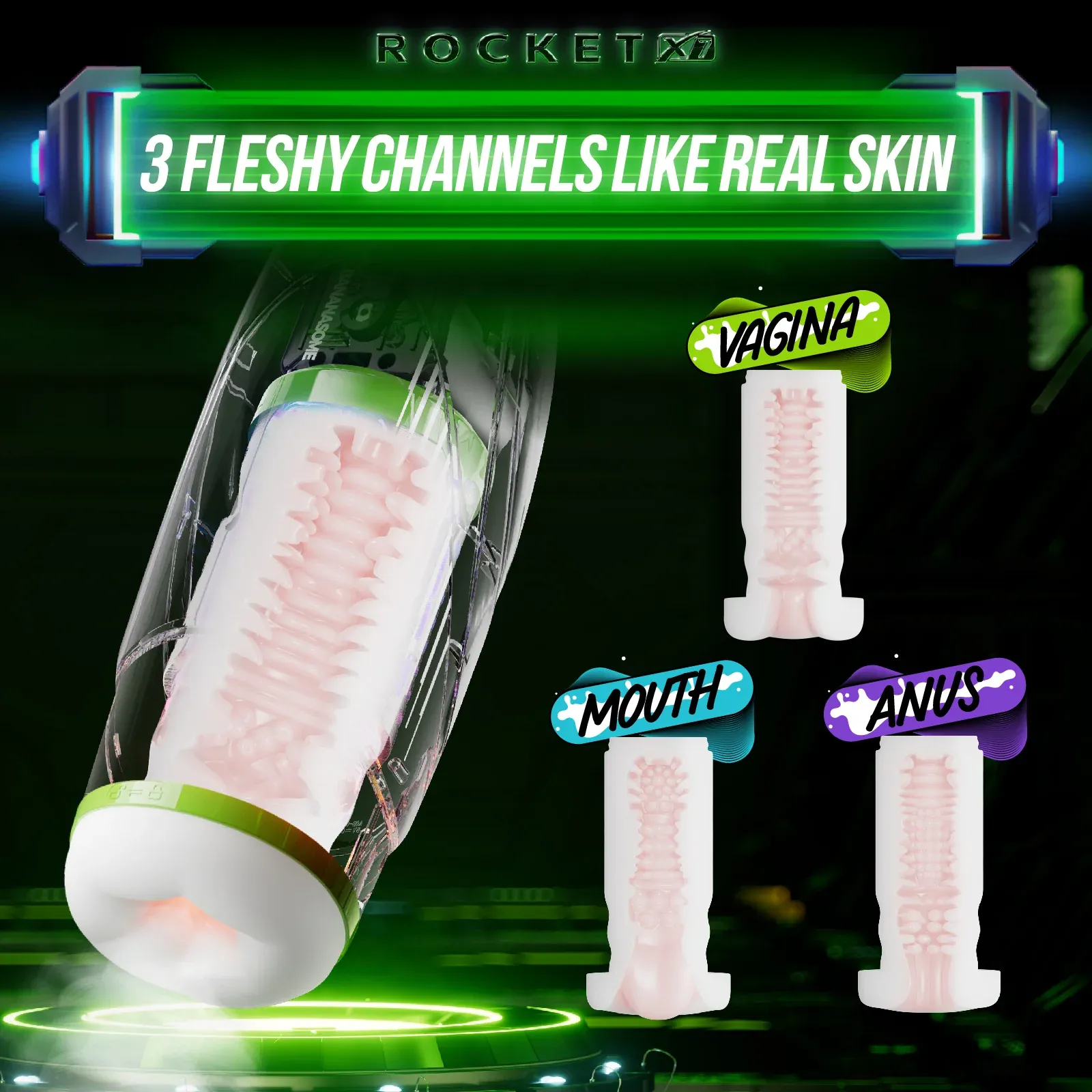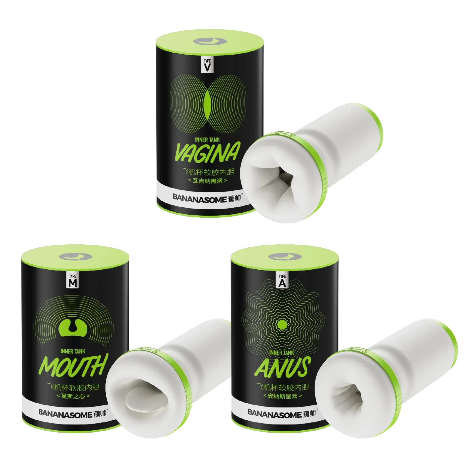 Bananasome Rocket X7 專用替換內膽,提供三款不同體驗的刺激通道:V 版(柔滑擬真通道)、M 版(環抱型口部通道)、A 版(緊緻深層通道)。每款皆採用高彈力 TPE 材質,觸感柔軟、包覆感強,搭配 X7 的震動與收縮效果,帶來更細緻、立體且層次分明的快感體驗。