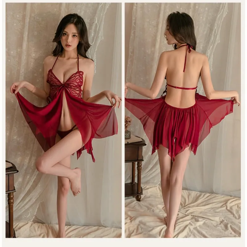 套裝包含細肩帶上衣與內搭款式,穿著後即可完成整體造型。紅色配色鮮明而富層次,適合成人情境穿搭、特別時刻或私密造型使用,是一款結合設計感與視覺吸引力的性感內衣套裝。