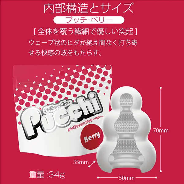 Men’s Max (日本) Pucchi Berry 隨身迷你飛機袋,為掌心快感注入全新感官體驗。採用「高清成型技術」與柔軟「PlusWetch」樹脂打造,外層包覆絨布質感,內層滑順細膩。只需加水,即可釋放柔軟黏潤的包覆感,為您帶來前所未有的自然享受。