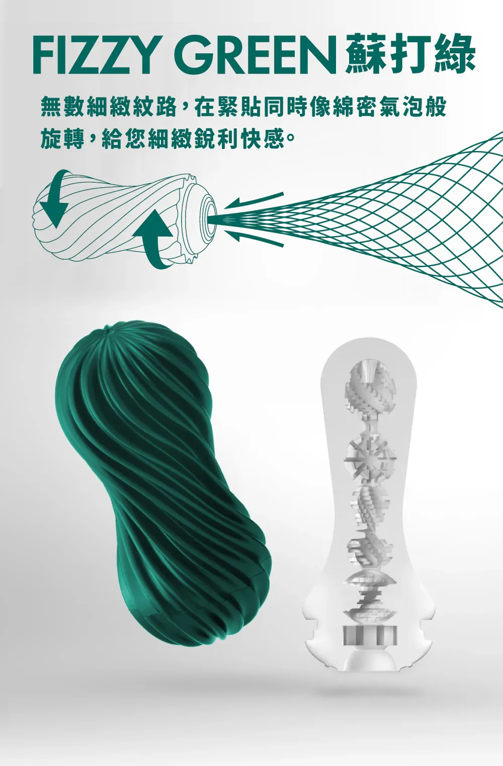 TENGA MOOVA FIZZY GREEN 蘇打綠 飛機杯 採用創新的螺旋流動設計與氣泡紋理結構,模擬氣泡上升般的輕盈觸感,打造出全新的柔順刺激體驗。