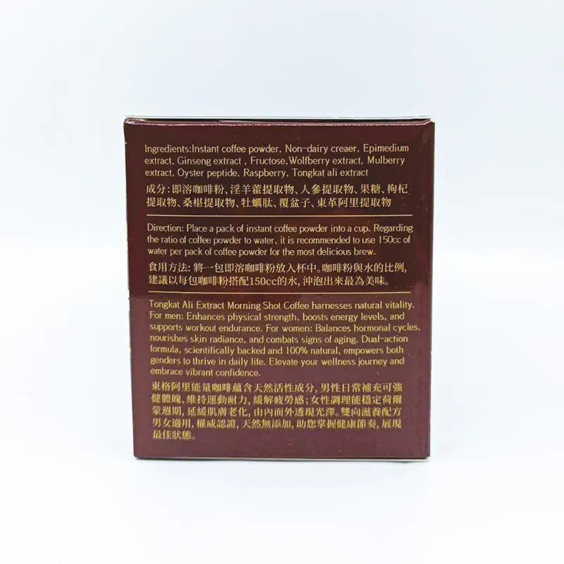 • 主要成分:即溶咖啡粉、Y羊藿提取物、人參提取物、果糖、枸杞提取物、桑堪提取物、牡蠣肽、覆盆子、東革阿里提取物