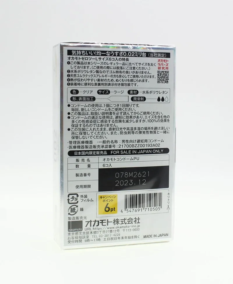 Okamoto(日本)0.02 EX 大碼版超薄安全套,全系列採用高透明度聚氨基甲酸酯(PU)製造,材質柔軟、導熱快速,能清晰感受到伴侶的體溫,帶來更自然的親密體驗。PU 不含一般橡膠味,並具良好的親膚性,適合希望提升舒適度的用家。