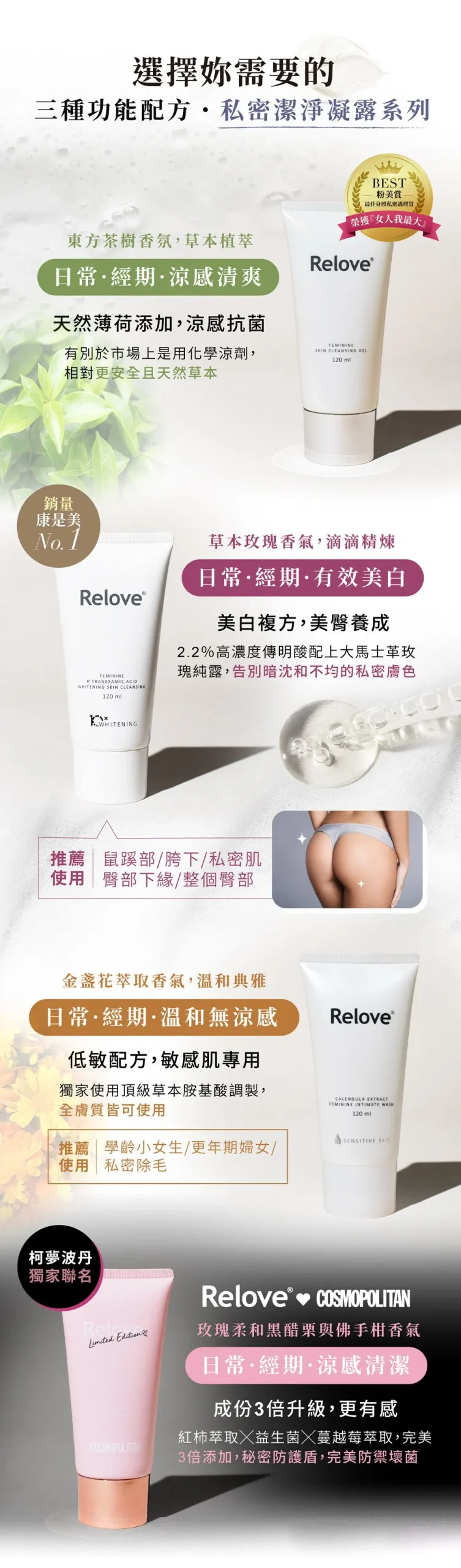 Relove 金盞花萃取低敏弱酸私密潔淨凝露以溫和弱酸配方設計,特別適合敏弱肌的每日清潔需求。質地柔潤細緻,深層潔淨同時維持私密肌的健康狀態,使肌膚潔淨、柔嫩、無負擔。