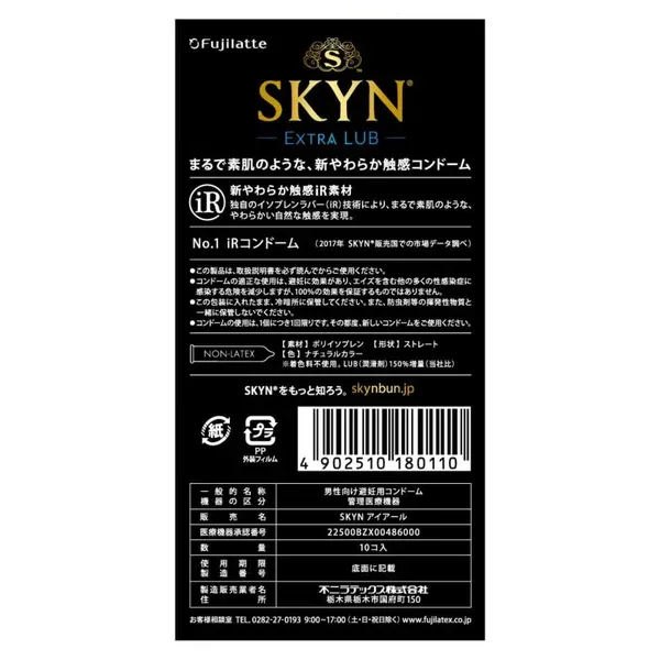 SKYN(日本)EXTRA LUB iR 極膚水潤額外潤滑安全套,由日本富士不二 Fuji Latex 出品,採用創新 iR(i-Rubber)非乳膠素材,帶來宛如肌膚相貼的柔軟觸感。整體輕盈貼身,配戴時彈性十足,同時保留親密互動中的細緻溫度與動態。