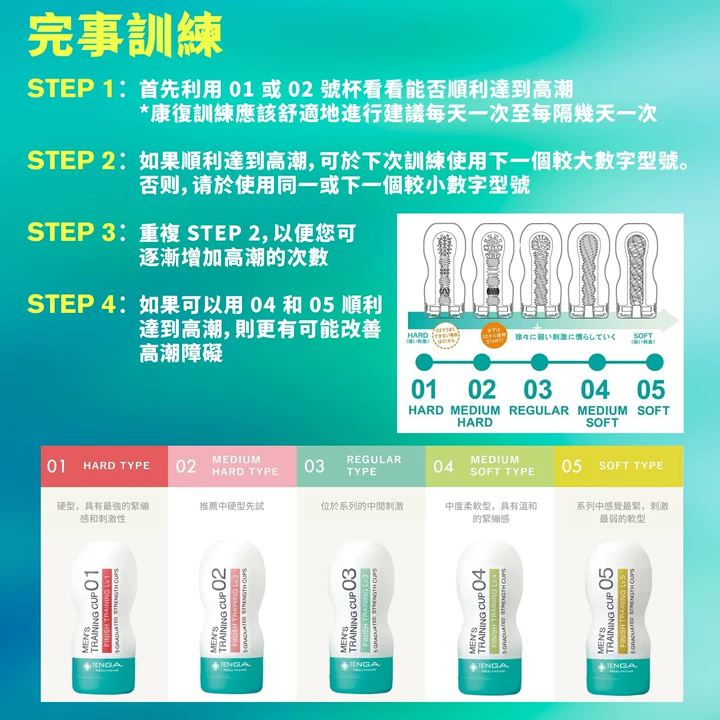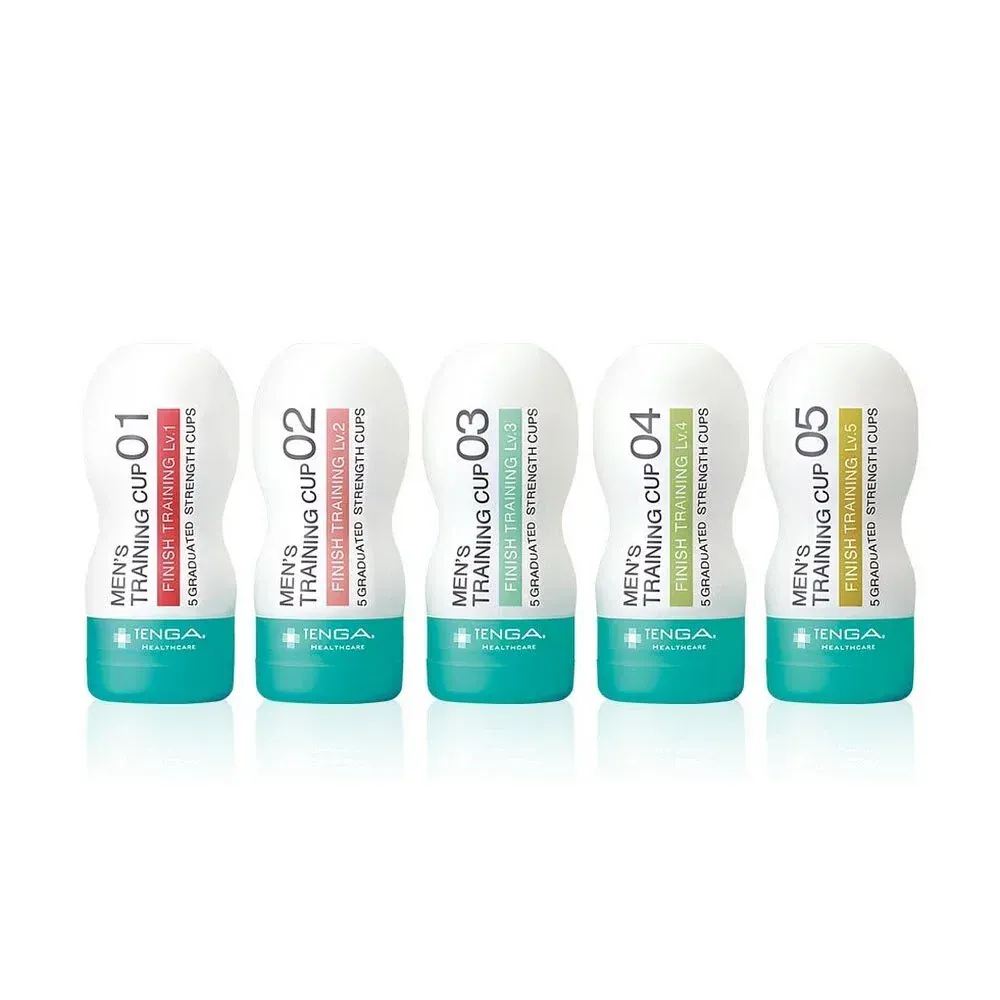TENGA HEALTHCARE 特別研發的「男性訓練杯 完事訓練系列」,專為改善男性因方式不當而造成的 延遲快感、快感障礙、不易射精 等問題。以 01~05 五款不同刺激程度的杯款,逐步訓練敏感度與射精反應,協助男性重建健康且正常的快感機制。