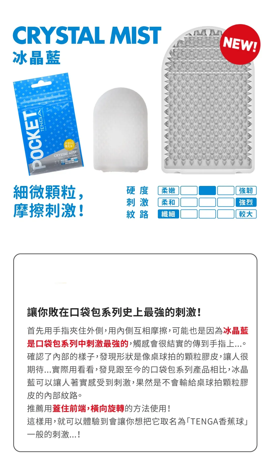 想要隨時隨地享受層層推進的刺激快感,TENGA 飛機袋 CRYSTAL MIST 為你帶來溫柔與強烈交錯的全新體驗。獨特邊緣引力結構設計,在包覆之間不斷觸發敏感點,猶如溫柔襲來後瞬間加強節奏,讓快感自然堆疊直達高峰。超薄輕巧設計,隨身攜帶無負擔,無論想快速放鬆或即時享受,都能輕鬆滿足。